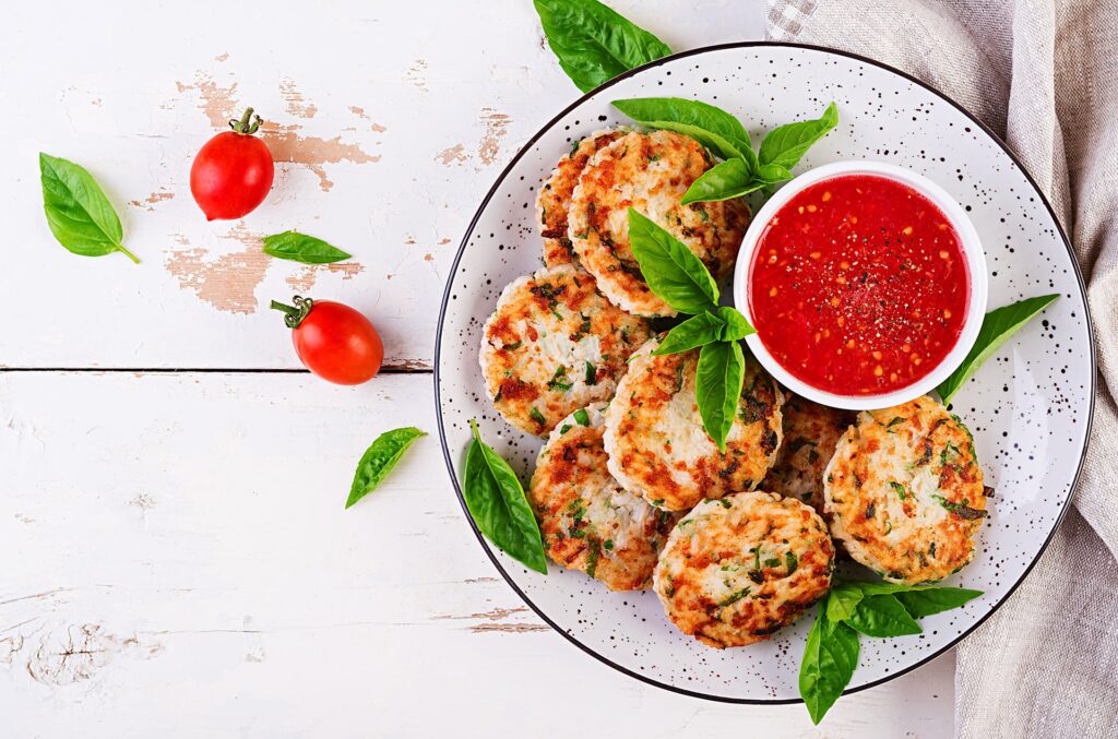 Delicious rice and chicken meat patties with garlic tomato sauce